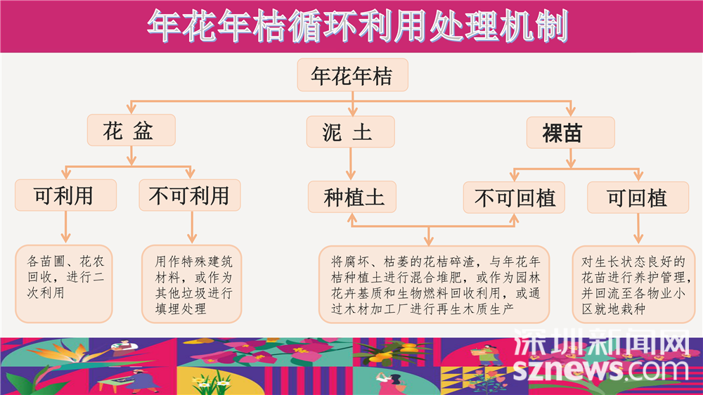 年花年桔收运处理工作的环保意义重大。废弃的年花年桔如果不得到妥善处理,不仅会占用宝贵的城市空间,还会对环境造成污染。回收后的年花年桔将按照“花、盆、泥”进行三分离,一方面将年桔和可以存活或再生的年花进行栽培;另一方面将枯死的年花和损坏的年桔作为园林绿化垃圾进行粉碎、堆肥处理,以实现年花年桔的回收再利用;此外,还会把回收利用保存完好的花盆、造型支架与养殖土,交由园林绿化企业资源化利用。