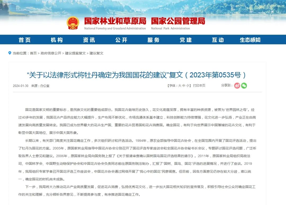 ● 据国家林草局网站消息,国家林草局1月30日发布《“关于以法律形式将牡丹确定为我国国花的建议”复文》。复文中提到,因各方面意见仍存在较大分歧,难以统一,确定国花的时机尚未成熟。