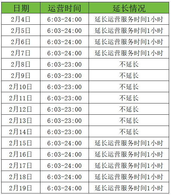 ● 2月4日-2月7日、2月15日-2月19日,深圳有轨电车延长运营服务时间1小时,其余日期维持不变。全程末班车发出后,新澜-观城、清湖-河西半程末班车相应延长。