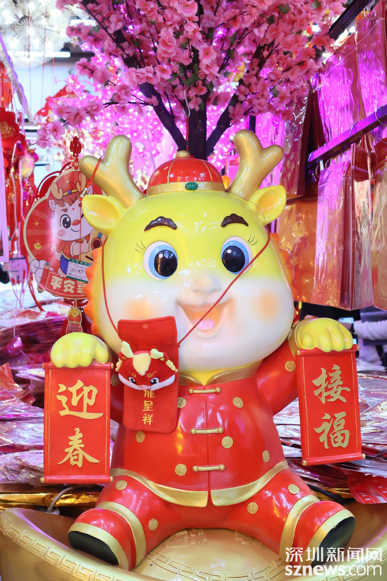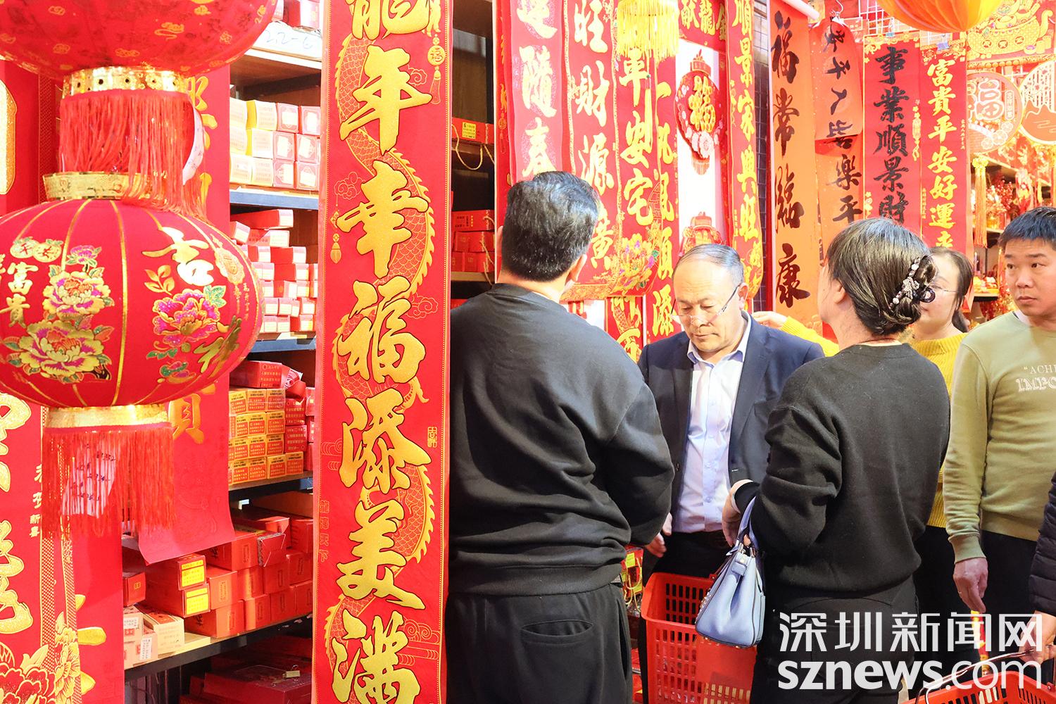“这灯笼的福字真好看,寓意不错,老板,我就要这个了。”“老板,这个舞狮挂件我买两个,能不能便宜点?”……市场过道里,市民们在摆满烫金“福”字、年花、对联、龙形玩偶的摊位前来回穿梭,询问价格,货比三家,挑选着心仪的商品。