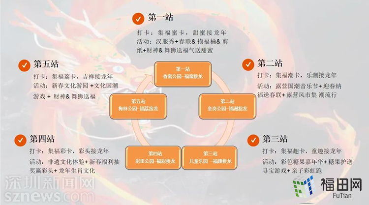 巡游+年俗+演艺、市集+文创,这一次福田放大招啦,开启龙年公园新玩法!1条国潮巡游线路串联香蜜公园、皇岗公园、深圳儿童乐园、彩田公园、梅林公园5个公园,邀请市民游客打卡集福字、聚福成龙,在公园里找到过年“新趣味”。