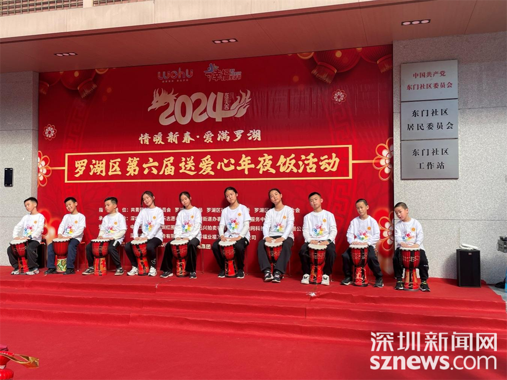 活动现场,数名来自罗湖区民乐志愿者协会的深港小志愿者非洲鼓演奏《听我说谢谢你》拉开了本次活动的序幕。罗湖区团区委副书记罗楚龙、罗湖区民政局副局长蓝茜、东门街道办事处副书记杨映玫,以及多家爱心企业代表一起为罗湖区特殊贡献群体代表,顺丰、美团、盒马以及环卫工代表、老革命战士和老党员送上了年味十足、种类多样的“新春包裹”以及爱心大盆菜,并向他们送上最诚挚的新春祝福。