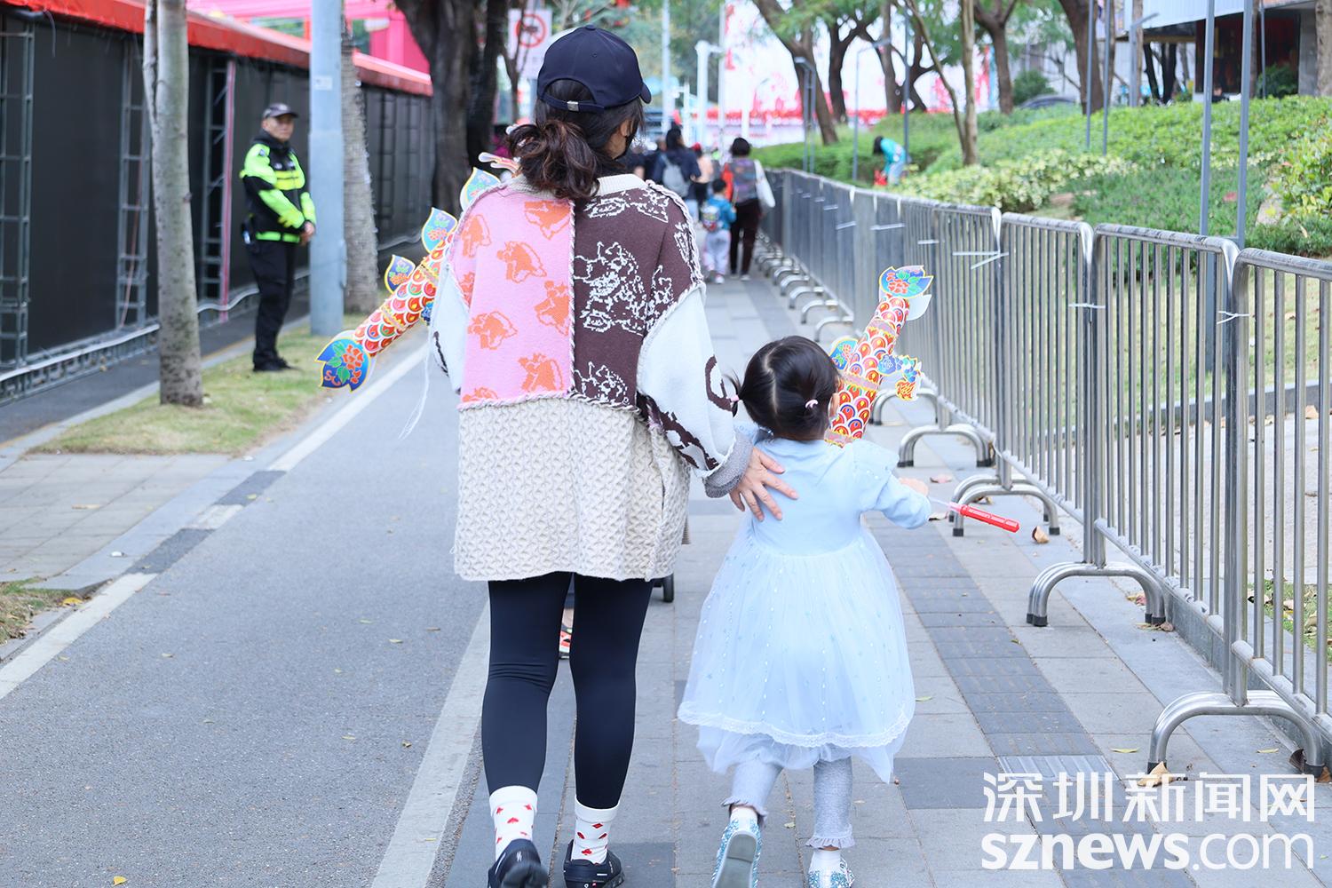 拿着在花市买的新春龙形摆件,一家人开开心心地回家。