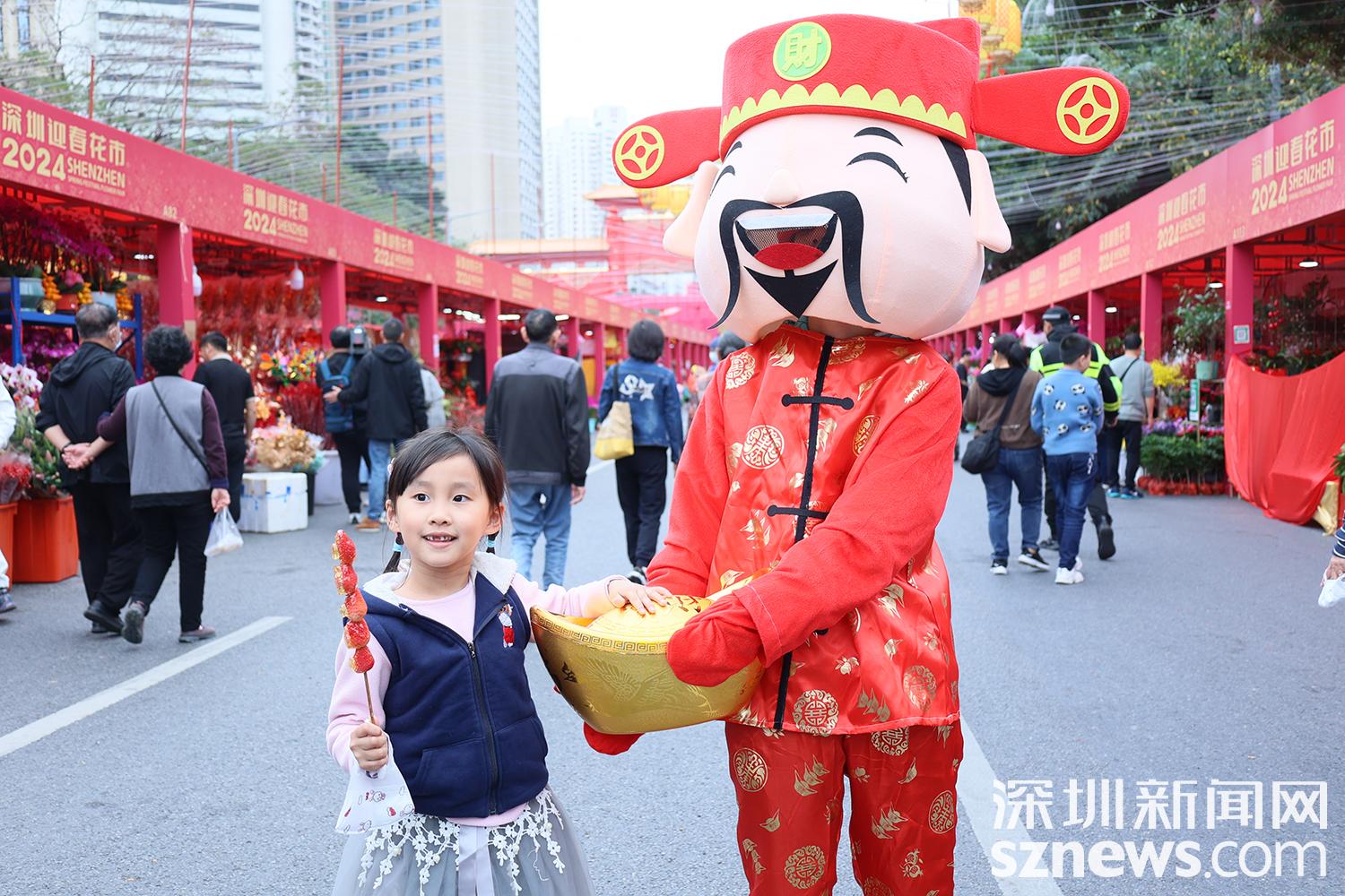在迎春花市里,财神爷也是一个不可或缺的角色,摸摸财神爷的金元宝,期待来年财源滚滚来,因此,财神爷便成了花市的“宠儿”,许多人与财神爷合照,希望给新的一年带来更多的好运和福气。