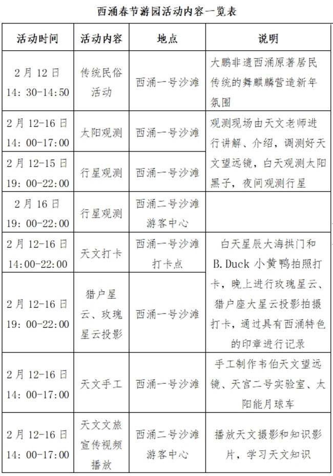 据了解,本次游园会活动由南澳办事处、深圳市天文台主办,西涌社区党委、西涌股份合作公司、深圳市天文学会承办,活动将持续到大年初七22点,内容包括春节游园、亲子天文手工、望远镜观星、超萌B.Duck小黄鸭打卡……