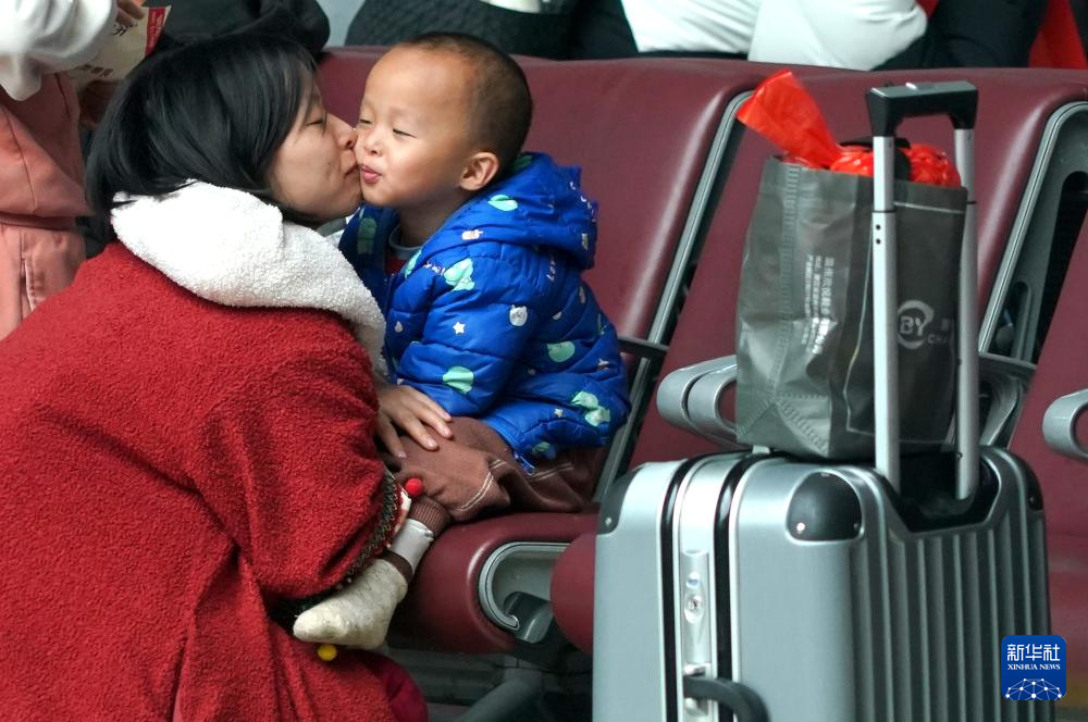 2月17日,在郑州东站候车大厅,一名旅客在候车间隙与孩子互动。新华社记者 李安 摄