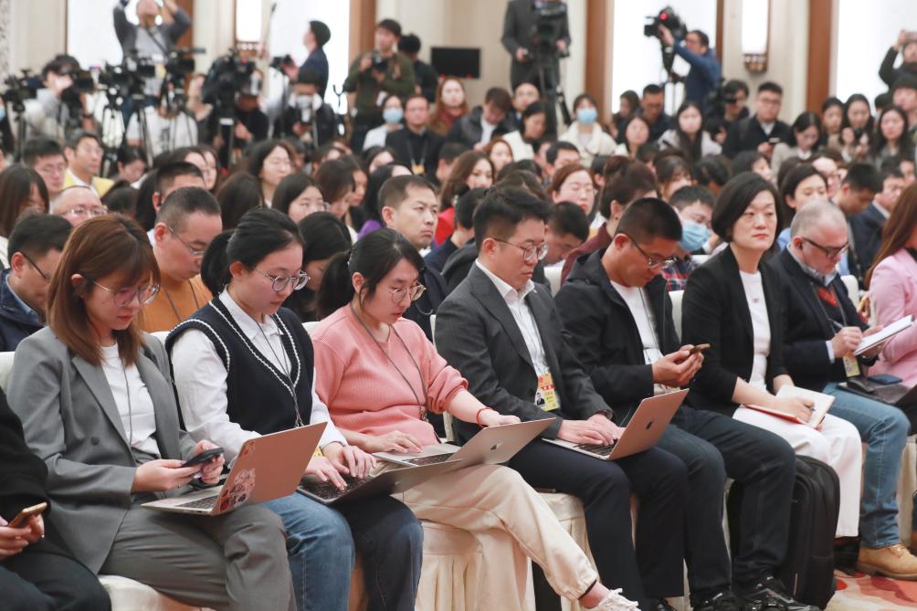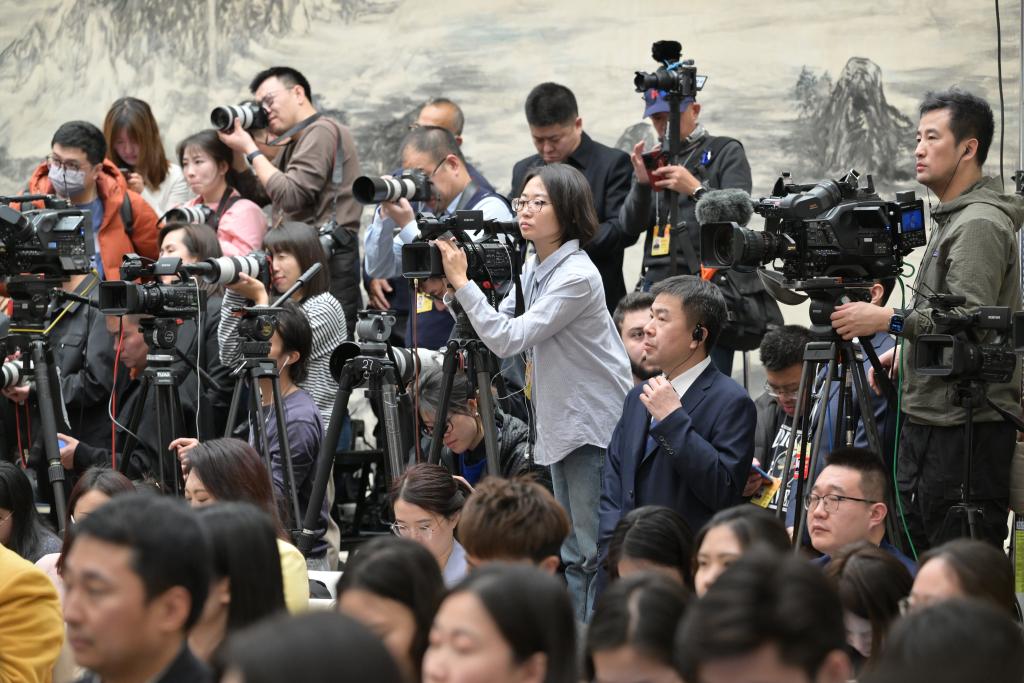 3月4日,十四届全国人大二次会议在北京人民大会堂举行新闻发布会。大会发言人娄勤俭就大会议程和人大工作相关问题回答中外记者的提问。这是记者在发布会上采访。