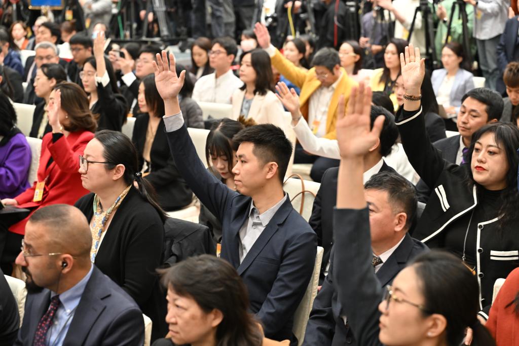 3月4日,十四届全国人大二次会议在北京人民大会堂举行新闻发布会。大会发言人娄勤俭就大会议程和人大工作相关问题回答中外记者的提问。这是记者举手提问。