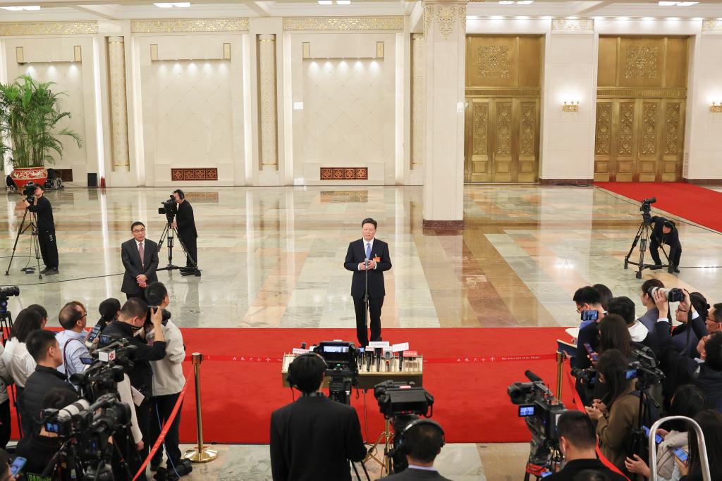 3月11日,第十四届全国人民代表大会第二次会议第三场“部长通道”集中采访活动在北京人民大会堂举行。这是记者在现场采访拍摄。