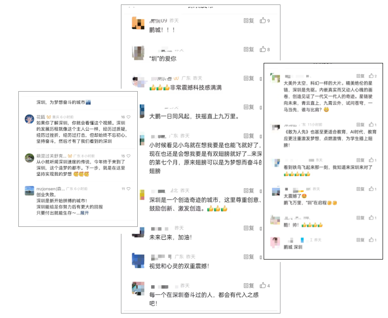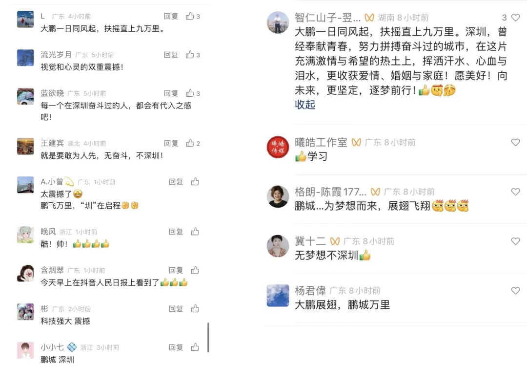 “如果你了解深圳,你就会看懂这个视频。深圳的发展历程就像这个主人公一样,经历过质疑,经历过挫折,经历过打击,但却始终不忘初心,坚持奋斗,然后才有了我们看到的深圳。”网友们纷纷在推文和视频评论区留言,分享着自己在深圳生活的点点滴滴,其中有温暖的回忆,有奋发的现在,也有对未来热切的期盼,字里行间流露出大家对深圳这座城市甜蜜的依恋。