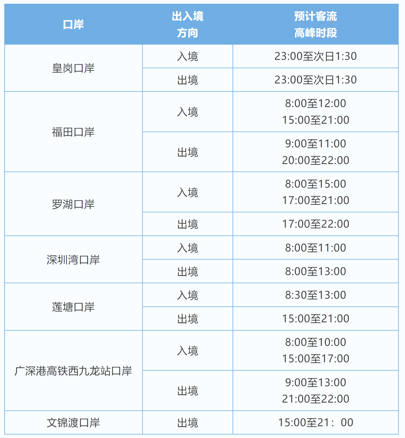 “五一”假期,深圳陆路口岸入境客流高峰预计出现在5月1日、4日,出境客流高峰预计出现在5月1日、5日,客流高峰期高峰时段如下: