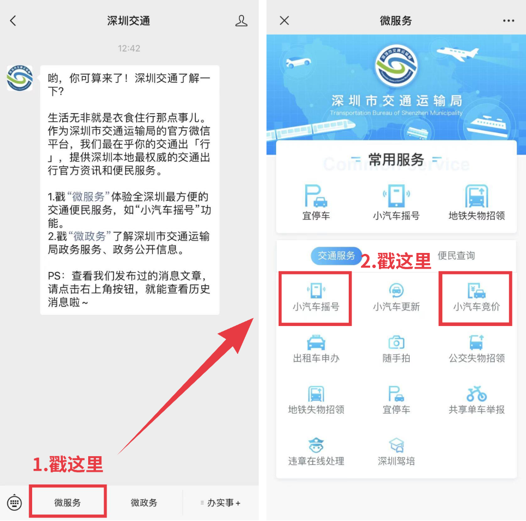 关注并进入“深圳交通”微信公众号 -点击“微服务”菜单栏 -点击“小汽车摇号”、“小汽车竞价”功能。