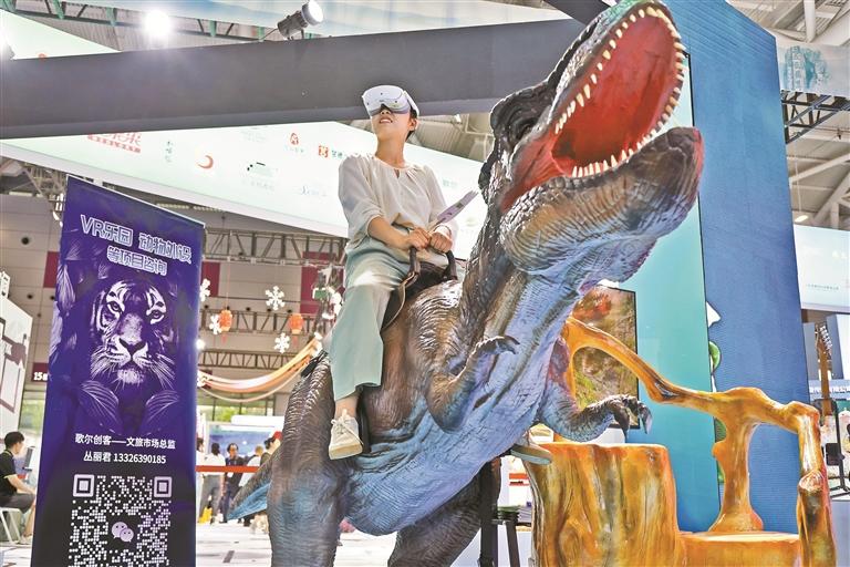 在文旅融合·文化消费展(15号馆),观众骑上恐龙“穿越”侏罗纪。