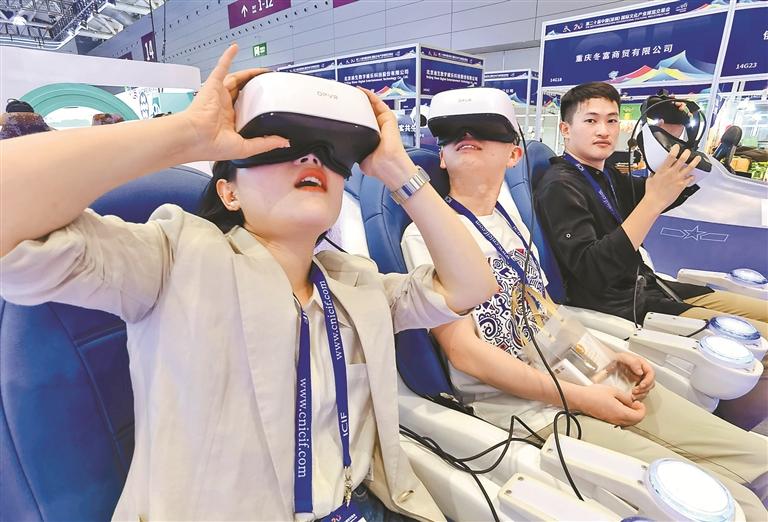 市民踊跃参观文博会,一时间呈现爆棚景象。参观者体验“战车”。 深圳商报记者 廖万育 摄