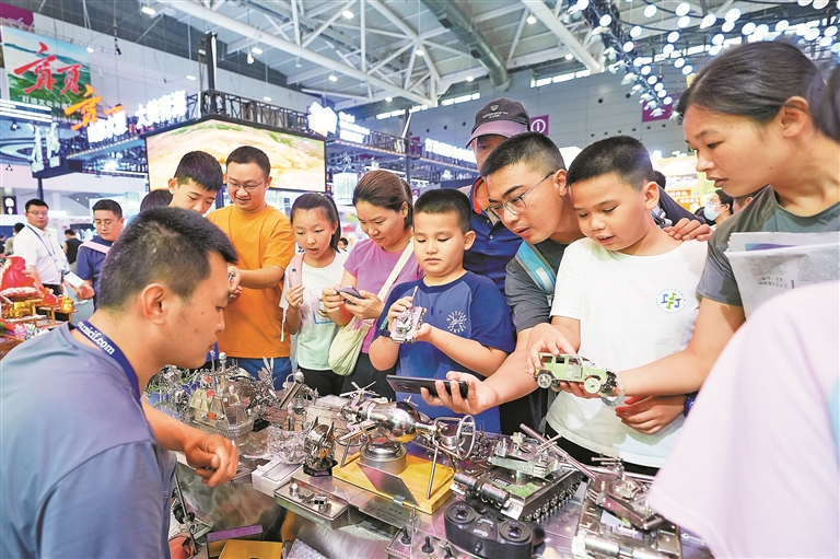 5月26日,第二十届文博会主会场,在一处展位前,由不锈钢制成的手工艺品引来众多观众抢购。 深圳晚报记者 严文婷 摄