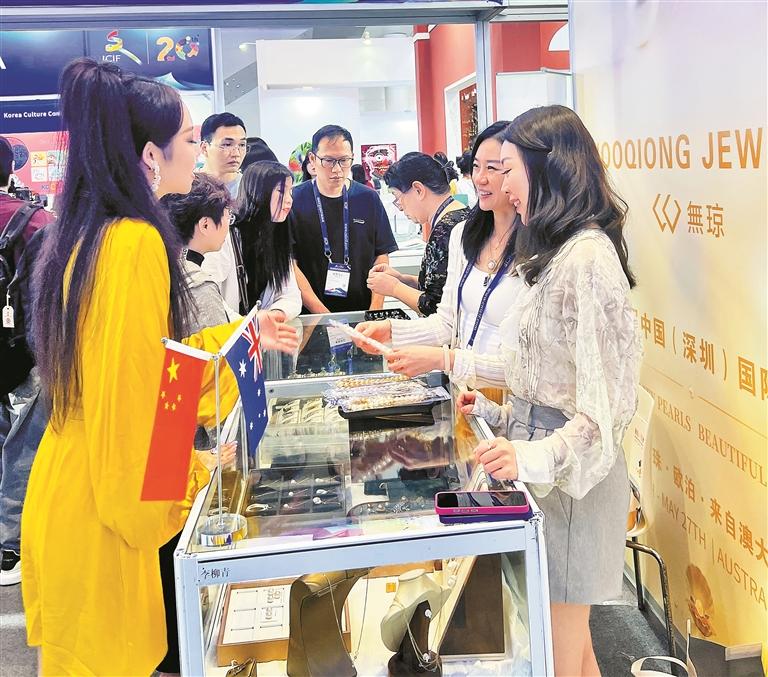 “发现澳大利亚”珠宝展区,工作人员向游客介绍澳白珍珠和欧泊宝石。