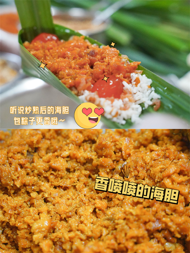 海胆粽,主打一个“鲜”,好吃的味道源于干净的原材料。两条芒叶、些许糯米和花生碎,一大勺海胆肉、一把瑶柱虾米。质朴、天然、美味,这就是南澳海胆粽的配方。