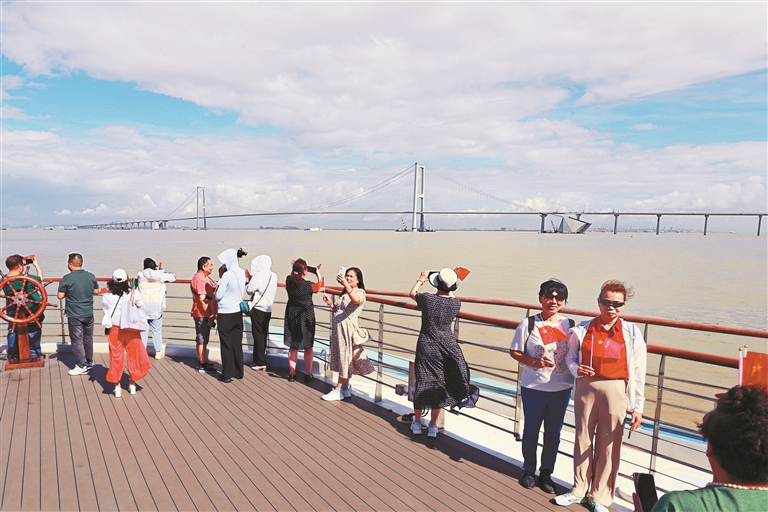 深圳新闻网2024年6月22日讯(深圳特区报记者 刘钢 张智伟)深中通道开通在即,各方争相先睹为快。昨日,一批市民游客从蛇口邮轮母港乘船出发,途经蛇口集装箱码头、孖洲岛、前海湾等重要地标,与深中通道近距离合影。