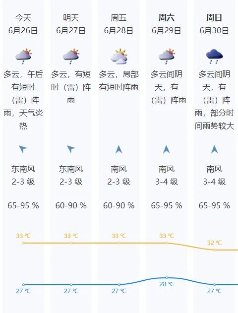 预计26-28日多云为主,局地有短时(雷)阵雨,天气炎热,间中有分散(雷)阵雨,26日气温27-33℃。