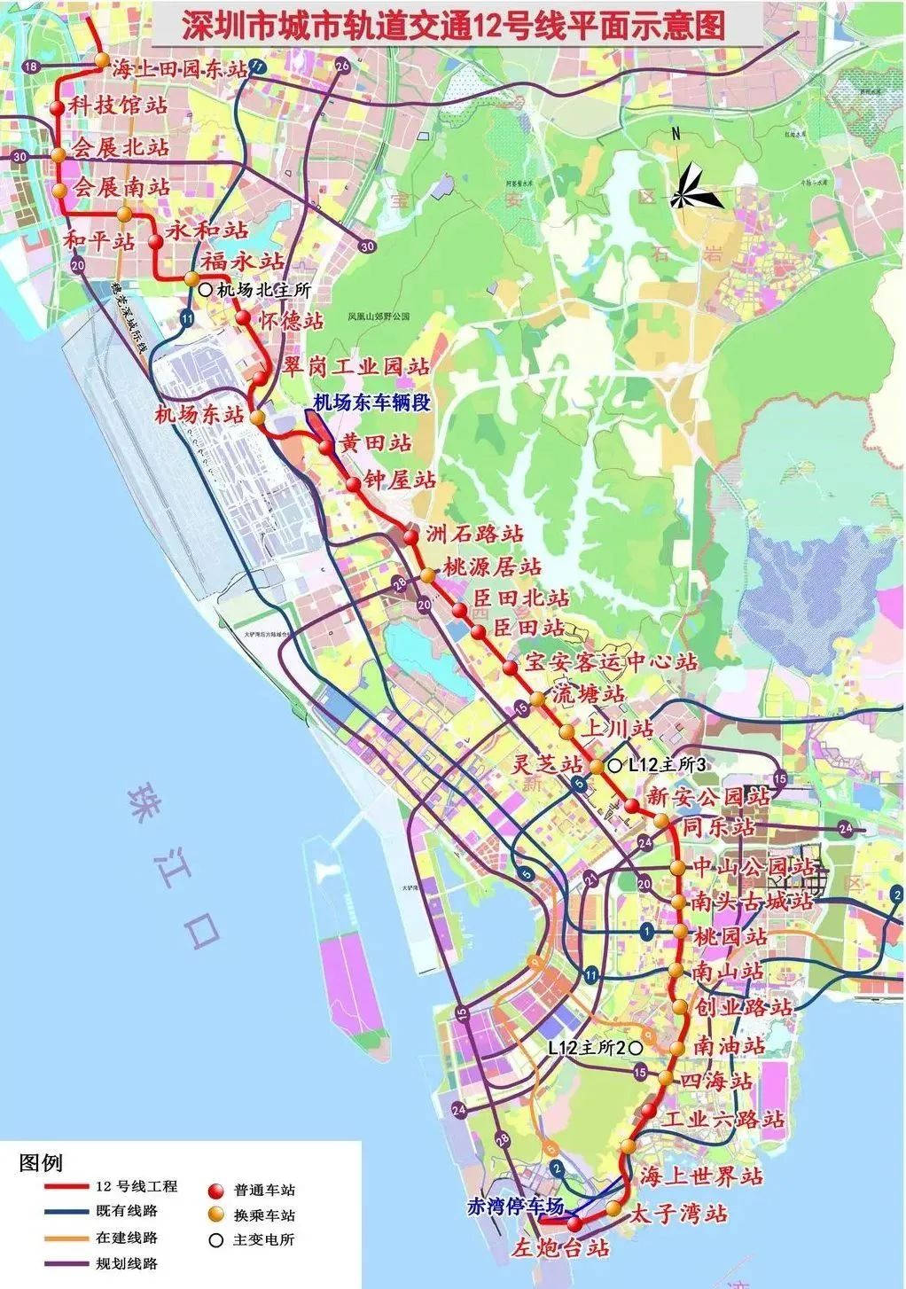 12号线线路起自南山区左炮台站,自南向北穿越南山中心区、宝安中心区、福永片区、大空港及会展片区后,终至宝安区海上田园东站。线路于2022年建成通车,有效缓解南山片区、宝安片区交通拥堵压力,支撑深圳西部发展轴带建设。