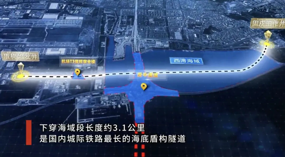 穗莞深城际在深圳段的延长线包括深圳机场至前海段(简称“机前段”)和前海至皇岗口岸段(简称“前皇段”)。其中穗莞深城际机前段,需下穿3.1公里的西湾海域。