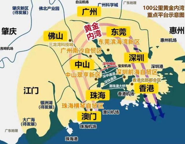 广东省第十三次党代会报告提出,要打造100公里“黄金内湾”,其中明确将以珠江口东西两岸融合发展作为突破口,带动广州、深圳、珠江口西岸三大都市圈融合发展。