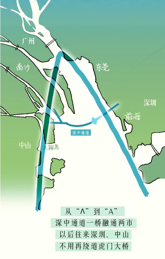 “与其他跨江跨海通道相比,深中通道优化了珠江口跨江通道格局。”中国(深圳)综合开发研究院港澳及区域发展研究所所长张玉阁认为,珠江口呈现“A”字形结构,现有的黄埔大桥、南沙大桥、虎门大桥主要分布在“A”的顶端,港珠澳大桥则在“A”的末端,深中通道处在“A”的中间即“腰”的部位。