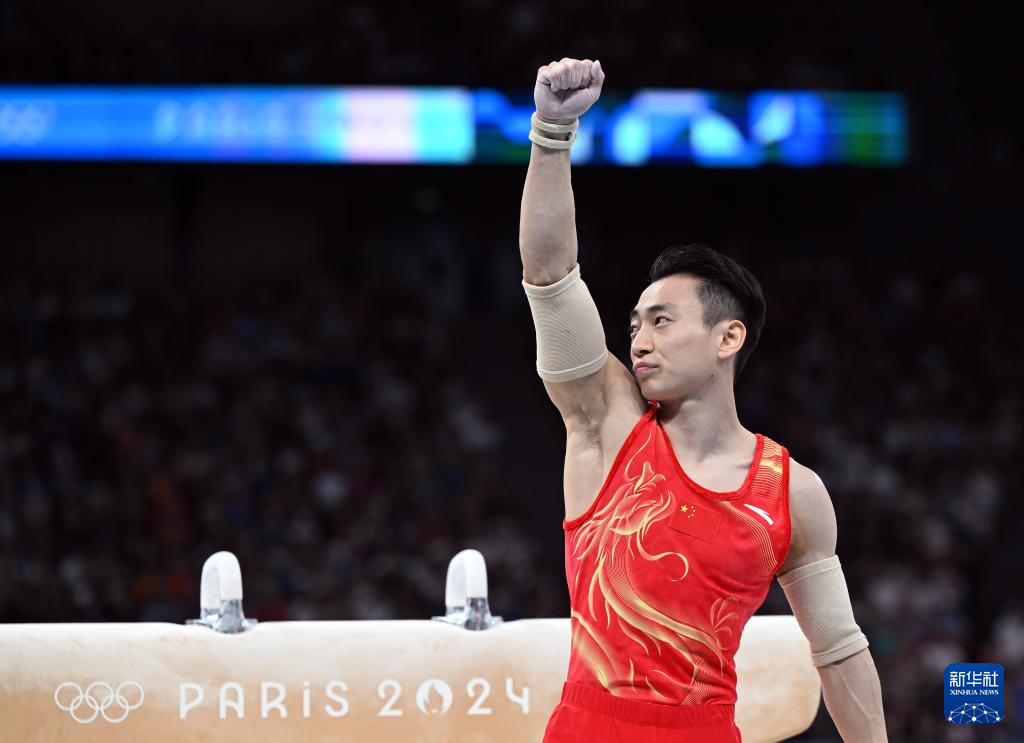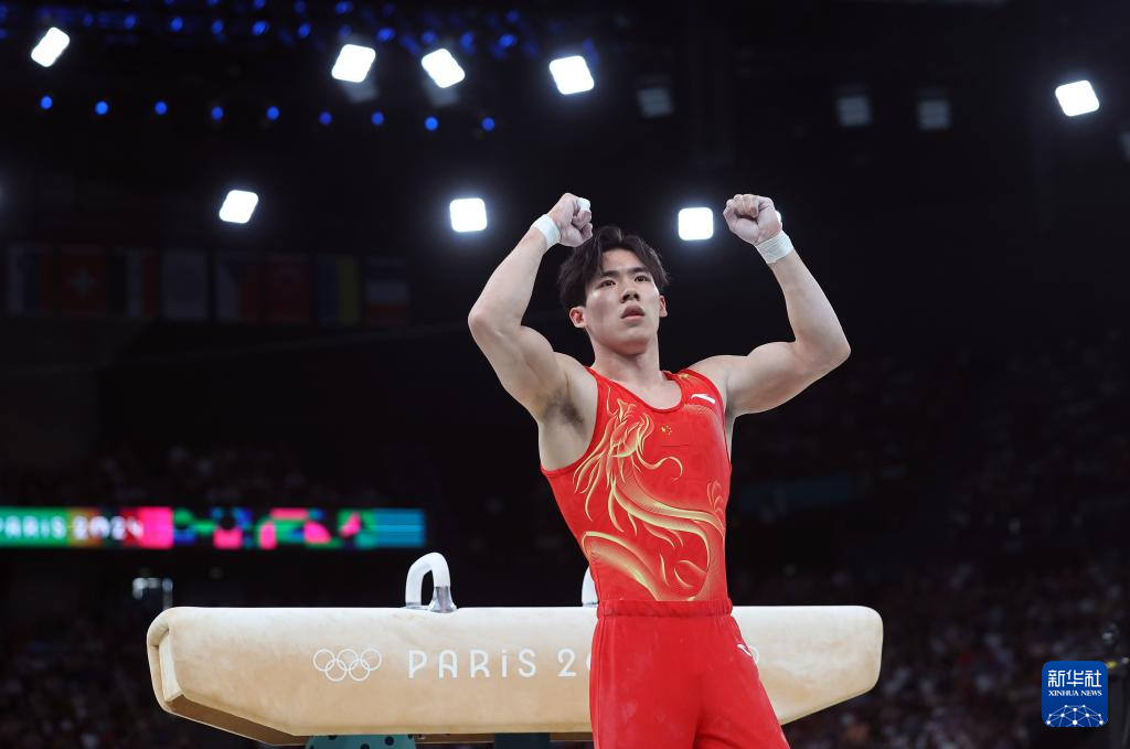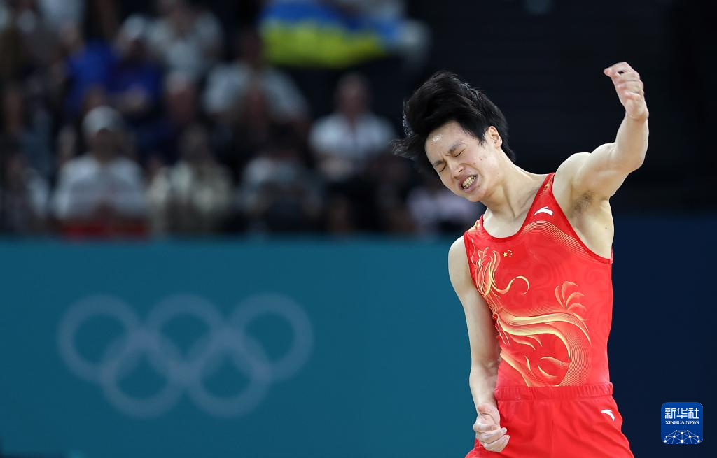7月29日,中国队选手张博恒在鞍马比赛后庆祝。