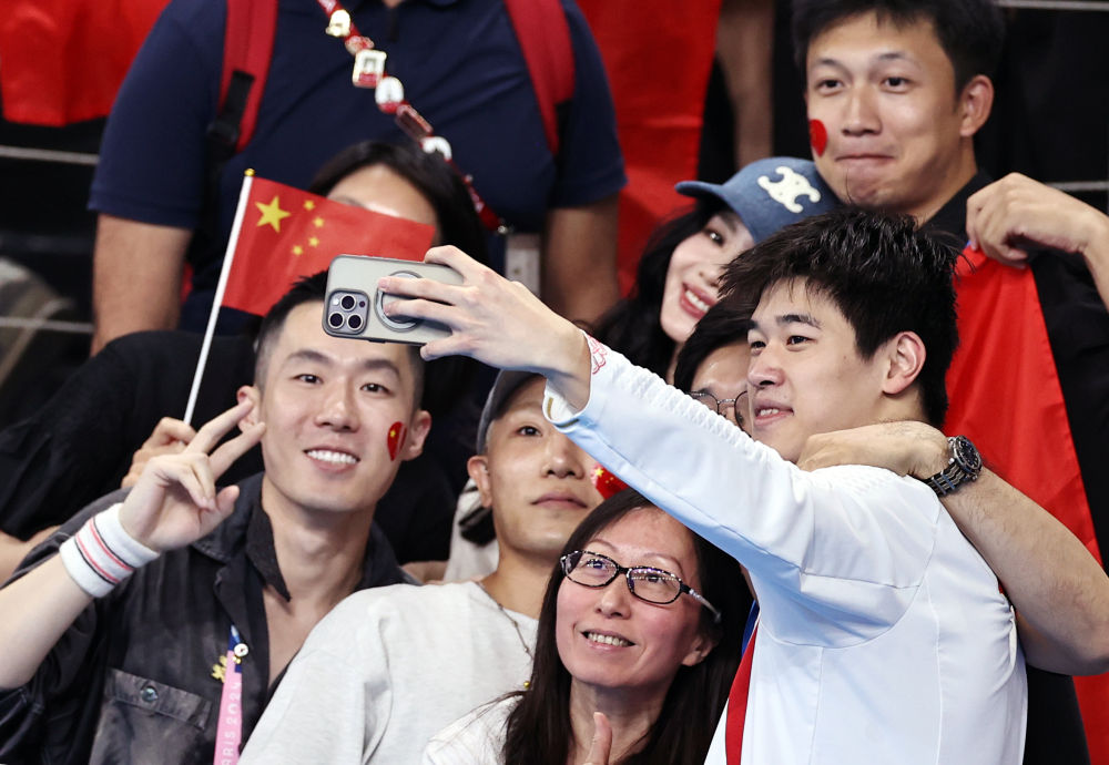 中国选手潘展乐(右一)在颁奖仪式后与观众合影。新华社记者 雒圆 摄