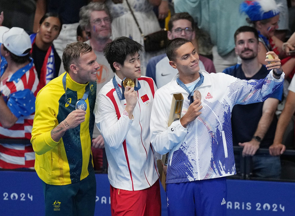 冠军中国选手潘展乐(中)、亚军澳大利亚选手查默斯(左)与季军罗马尼亚选手波波维奇在颁奖仪式后。新华社记者 雒圆 摄