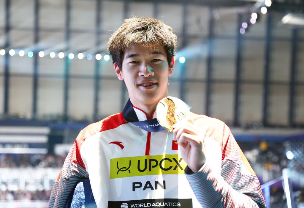 2024年2月15日,冠军中国选手潘展乐在颁奖仪式后留影。当日,在卡塔尔多哈举行的2024年世界游泳锦标赛男子100米自由泳决赛中,中国选手潘展乐以47秒53的成绩夺得冠军。新华社记者 雒圆 摄