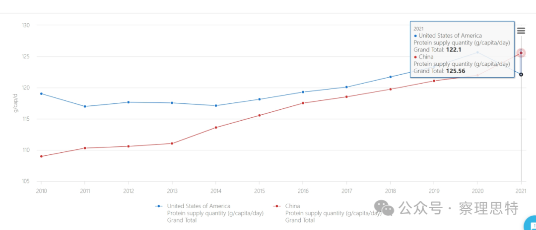 蛋白质摄入量是衡量现代生活质量的重要指标之一。联合国粮食及农业组织(FAO)的最新数据显示,2021年,中国人均每日蛋白质供应量达到125.56克,而美国为122.1克。这意味着,中国人均每天可通过膳食摄取的蛋白质已超过美国,达到了一些西方政客曾认为“中国不可能实现的成就”之一。