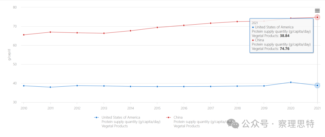 但值得注意的是,中国的蛋白质供应更多来源于植物,如蔬菜、水果、豆类等。这与美国形成了鲜明的对比。根据FAO数据库公开数据,2021年,中国人均每日植物蛋白供应量为74.76克,占比59.5%;而美国则为38.84克,占比31.8%。