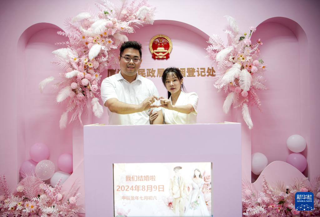 8月9日,一对新人在福建省厦门市民政局婚姻登记处合影留念。新华社记者 魏培全 摄