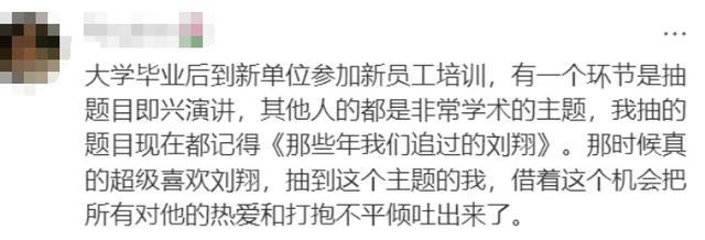 除此之外,还有不少网友提及关于刘翔的回忆。当年比赛的体育解说词,很多人倒背如流。评论区瞬间变得自带声音。有网友说,曾为了刘翔和爸爸吵架。刘翔本人回复:“下次叫上我”。有人表示,会把刘翔的海报贴在墙上激励自己。还有人说,曾把刘翔写进作文和演讲里。