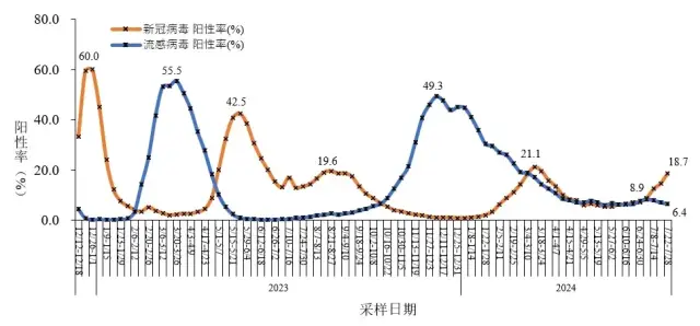 ▲全国哨点医院流感样病例新冠和流感病毒阳性率变化趋势