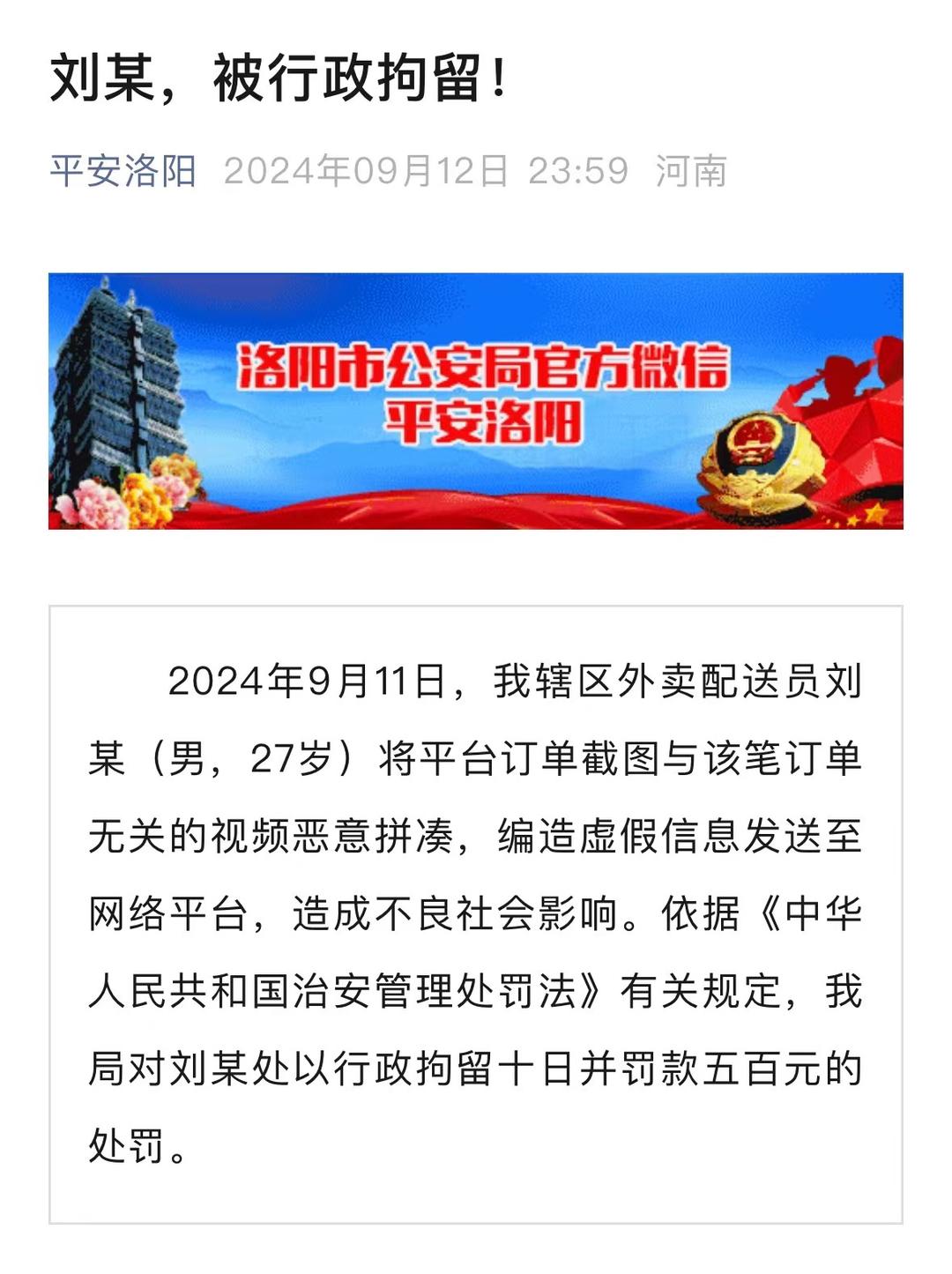 12日23点59分,洛阳警方在公众号“平安洛阳”发布该事件情况通报称,9月11日,该辖区外卖配送员刘某(男,27岁)将平台订单截图与该笔订单无关的视频恶意拼凑,编造虚假信息发送至网络平台,造成不良社会影响。依据《中华人民共和国治安管理处罚法》有关规定,对刘某处以行政拘留十日并罚款五百元的处罚。