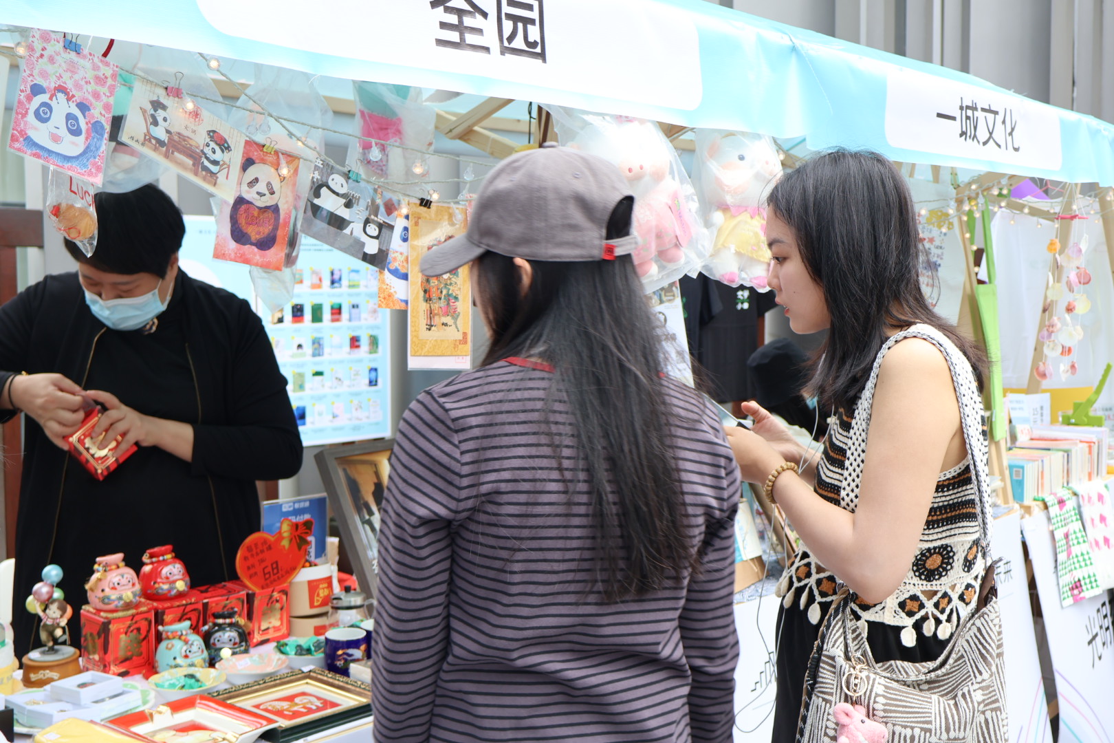 逛手工艺品摊位的年轻人(记者 童小晋摄)