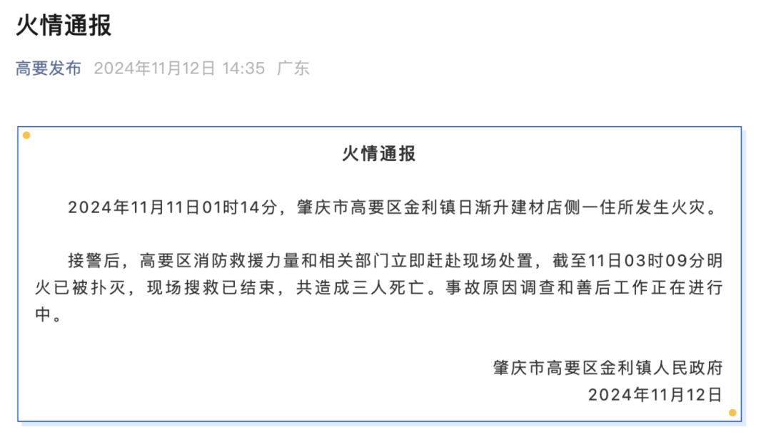 ● 11月12日,广东肇庆高要区通报,一建材店侧住所起火致3死。