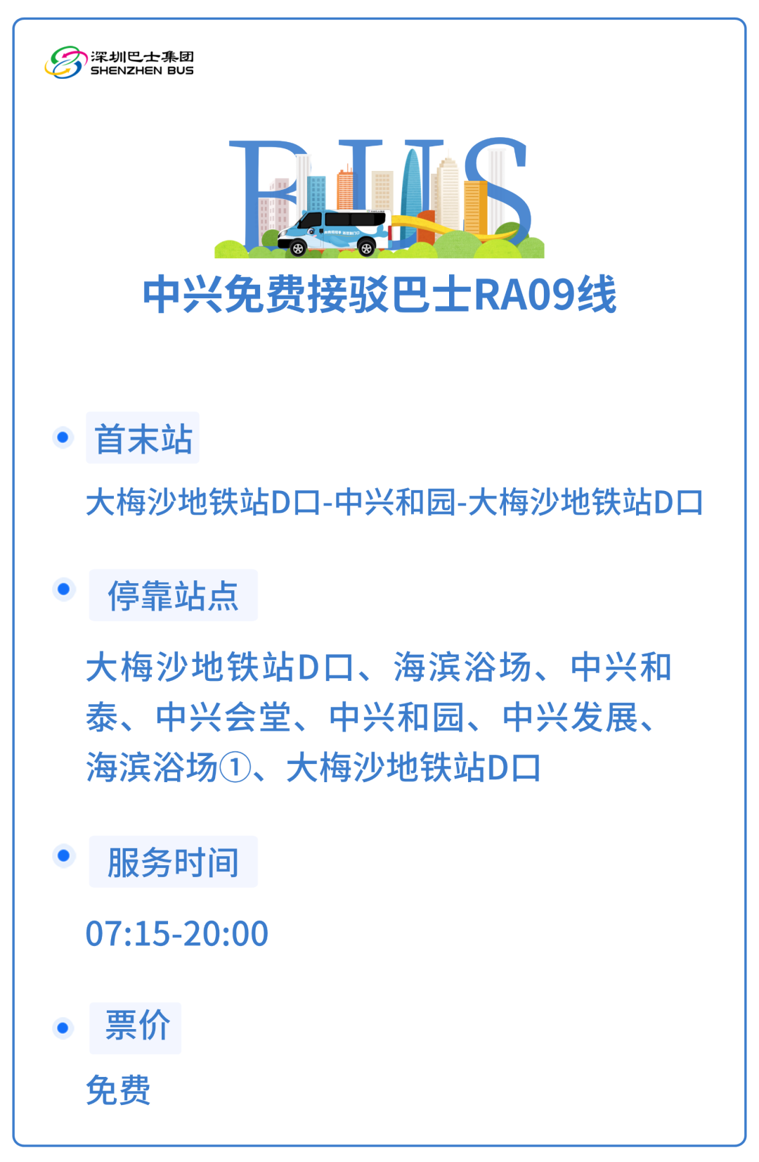 ● 大鹏:深圳巴士集团第二分公司开通了中兴免费接驳巴士,停靠站点包括大梅沙地铁站、海滨浴场以及中兴和园小区。