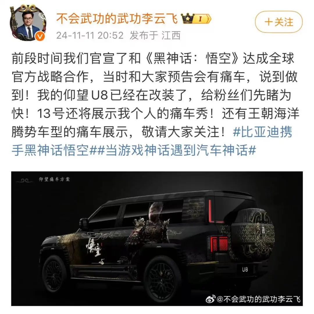 ● 11月11日,比亚迪集团品牌及公关处总经理李云飞分享了比亚迪 ×《黑神话:悟空》仰望 U8“痛车”造型,该车采用联名定制外观设计,车身印有游戏的经典图案画面。