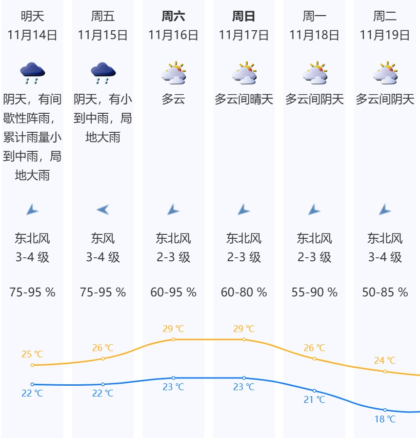 14-15日我市有间歇性平缓降雨,日雨量小到中雨局地大雨,14日沿海高地和海区最大阵风8级左右,气温22-25℃,15日风力减弱;