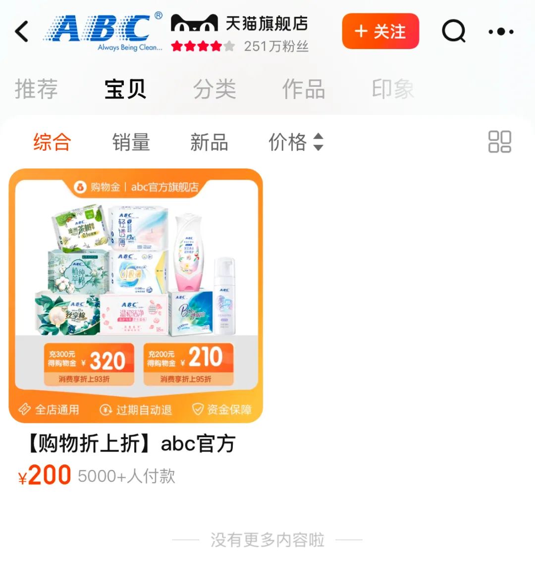● 11月17日,有媒体搜索发现,多家ABC卫生巾官方授权店铺下架了相关产品。而且ABC天猫旗舰店已没有产品在售。