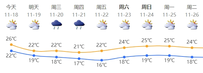 周三至周四(20-21日)受台风“万宜”残余云系影响,有阵雨,部分时间雨势较大,最低气温降至16℃左右,体感阴凉。展望周五至周日(22-24日)多云到晴天,白天气温小幅回升,早晚天气清凉。