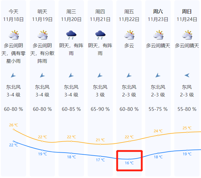深圳今日多云间阴天,偶有零星小雨;气温22-26℃;东北风3-4级,沿海、高地和海区最大阵风7级左右;相对湿度60%-80%。