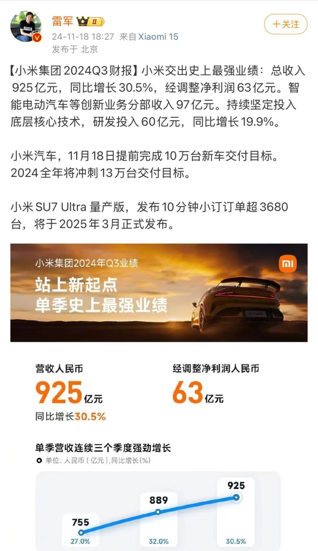 ● 11月18日,雷军发文称,小米交出了“史上最强业绩”:第三季度收入925亿元,同比增长30.5%。