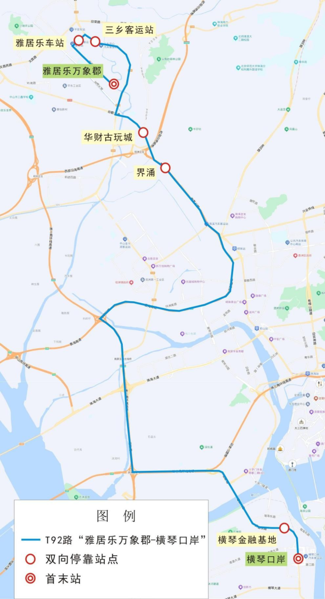 ● 为实现中山、珠海、澳门三地公交连通,中山公交集团定于11月18日起开通定制公交T92路线“雅居乐万象郡-横琴口岸”。