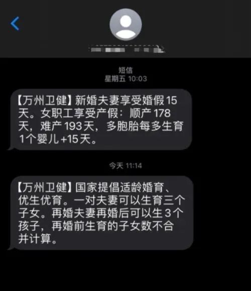 ● 重庆万州区“再婚夫妻再婚后可生3个孩子”群发短信受关注,当地卫健委回应:确实有群发两条短信。