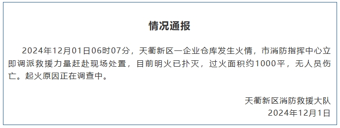 据“德州天衢新区”微信公众号消息,2024年12月01日6时07分,山东德州天衢新区一企业仓库发生火情,德州市消防指挥中心立即调派救援力量赶赴现场处置,目前明火已扑灭,过火面积约1000平,无人员伤亡。起火原因正在调查中。