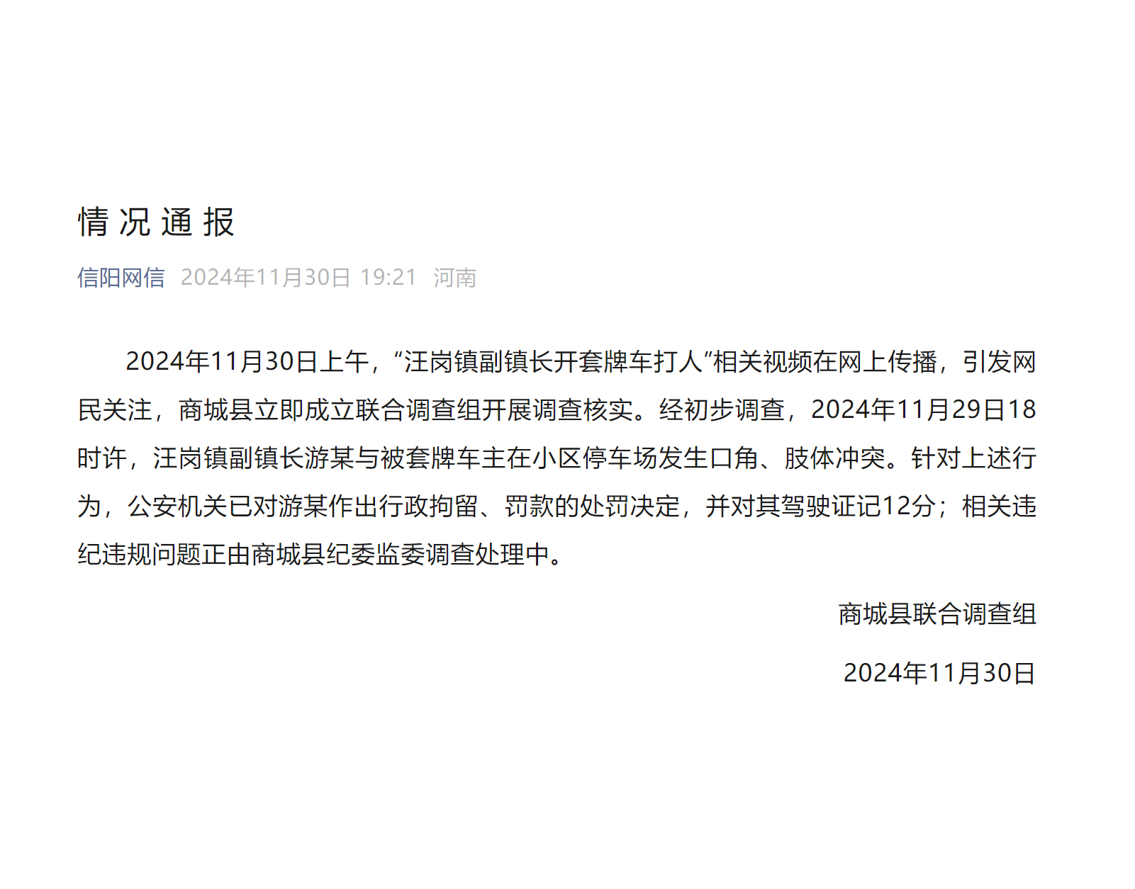 央视网消息:据信阳网信微信公众号消息,2024年11月30日上午,“汪岗镇副镇长开套牌车打人”相关视频在网上传播,引发网民关注,商城县立即成立联合调查组开展调查核实。经初步调查,2024年11月29日18时许,汪岗镇副镇长游某与被套牌车主在小区停车场发生口角、肢体冲突。针对上述行为,公安机关已对游某作出行政拘留、罚款的处罚决定,并对其驾驶证记12分;相关违纪违规问题正由商城县纪委监委调查处理中。
